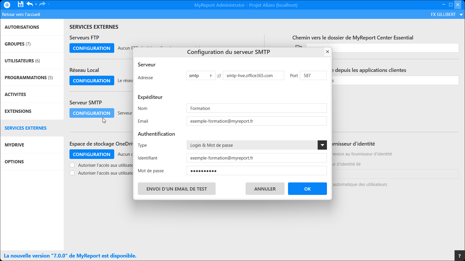 Par exemple, la configuration du serveur SMTP depuis MyReport Administrator Projet, menu « Services externes »