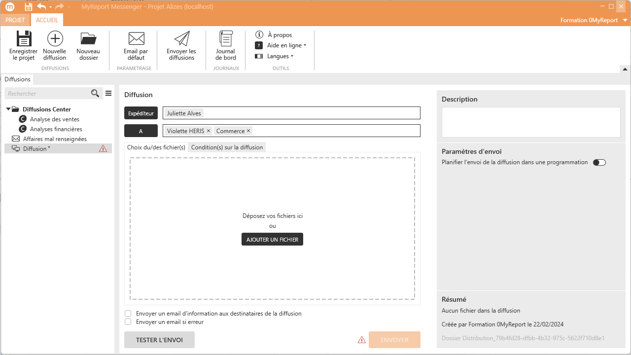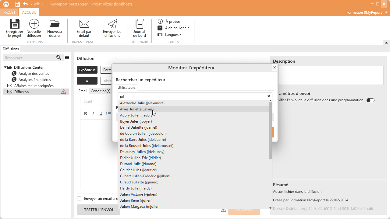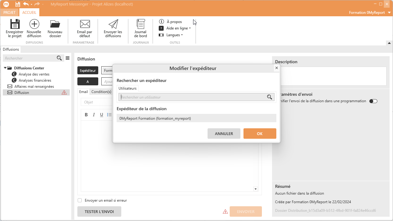 Par défaut, vous êtes l’expéditeur de la diffusion que vous venez de créer.