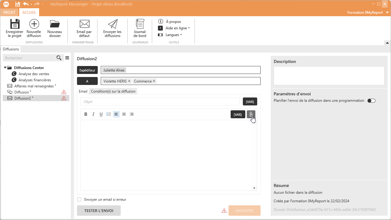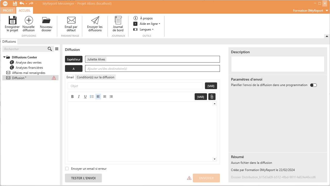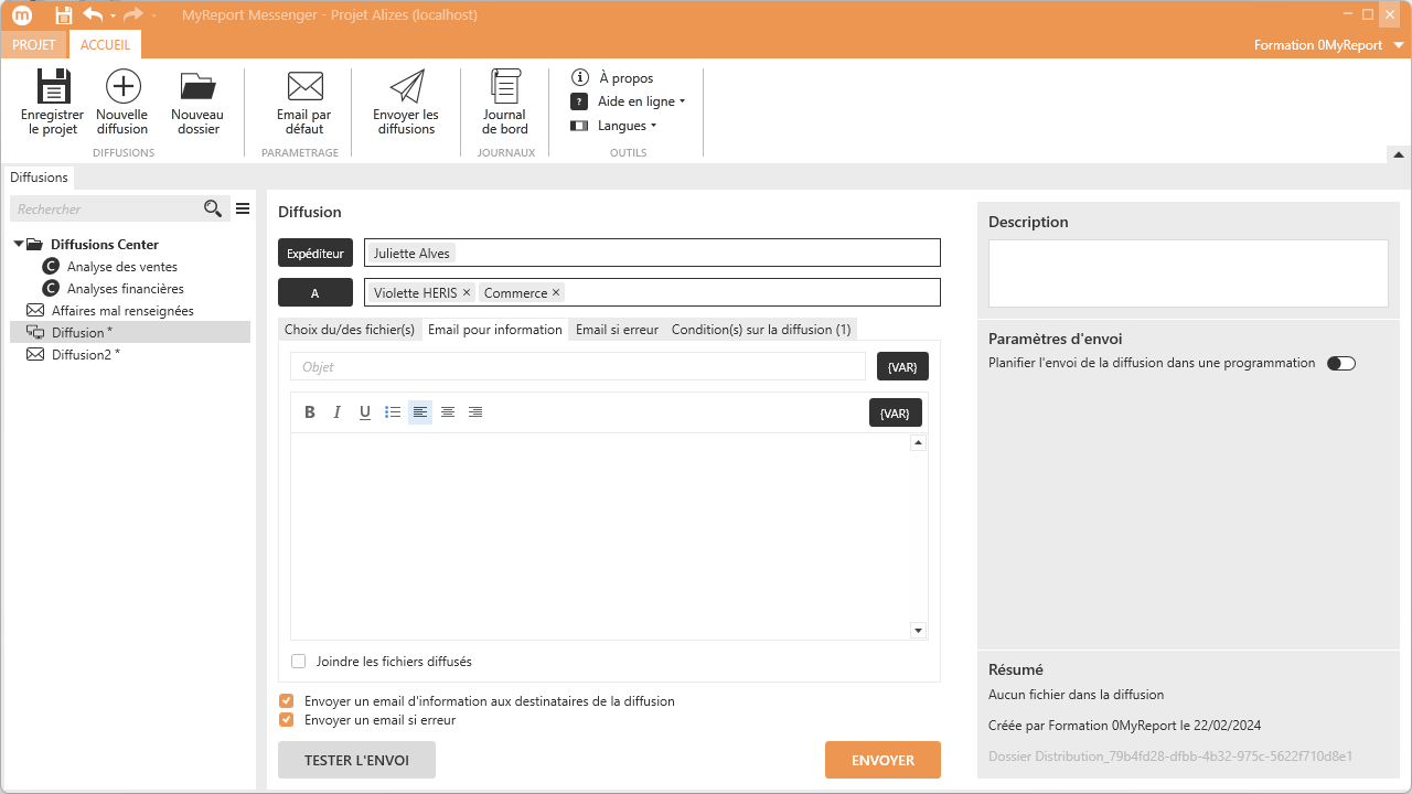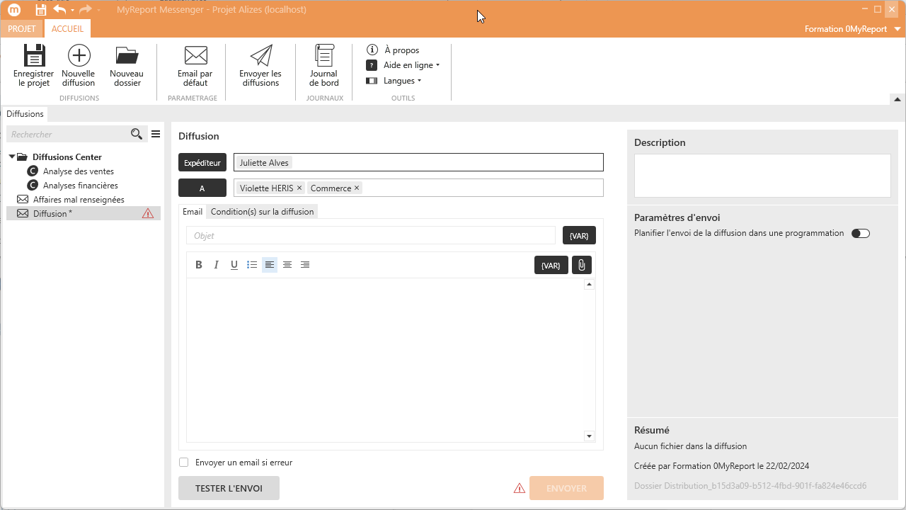 N'oubliez pas d'indiquer un objet comme titre pour une diffusion par mail.