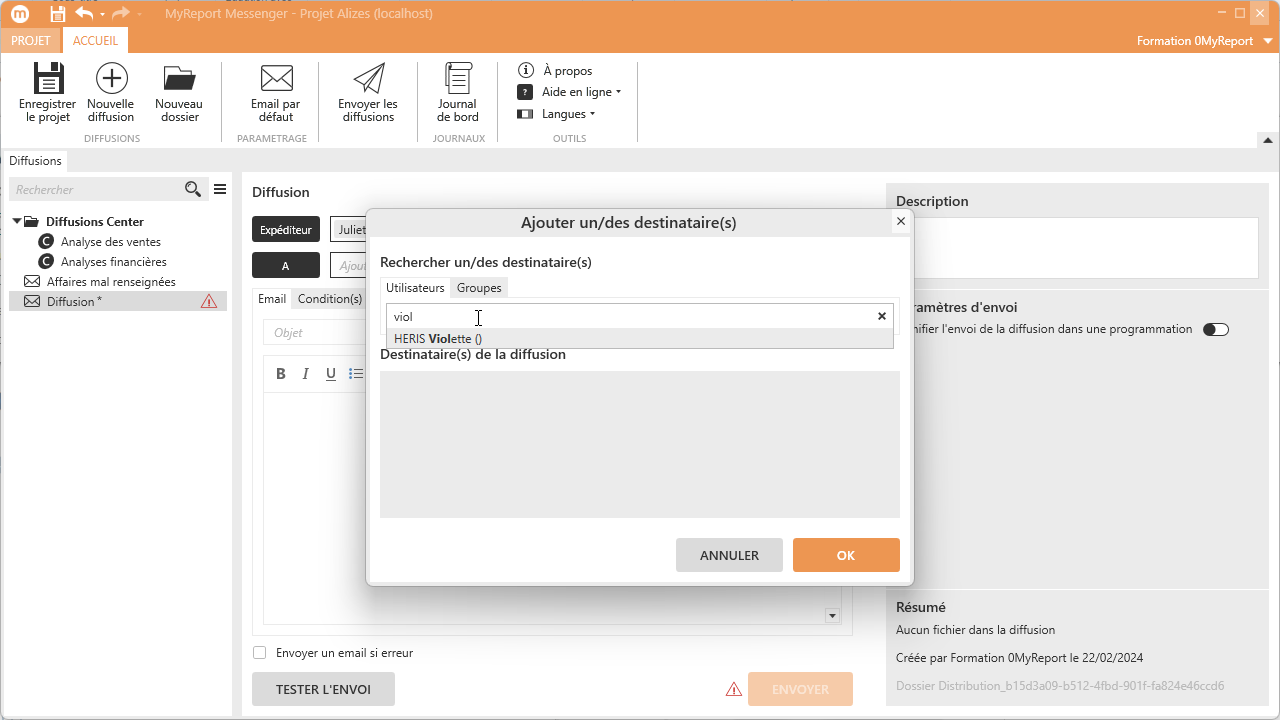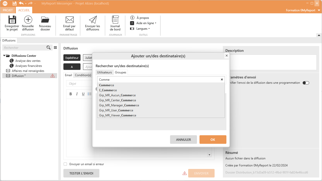 Dans l’exemple ci-dessus, la diffusion sera envoyée à l’utilisateur Violette HERIS et à tous les utilisateurs présents dans le groupe Commerce.