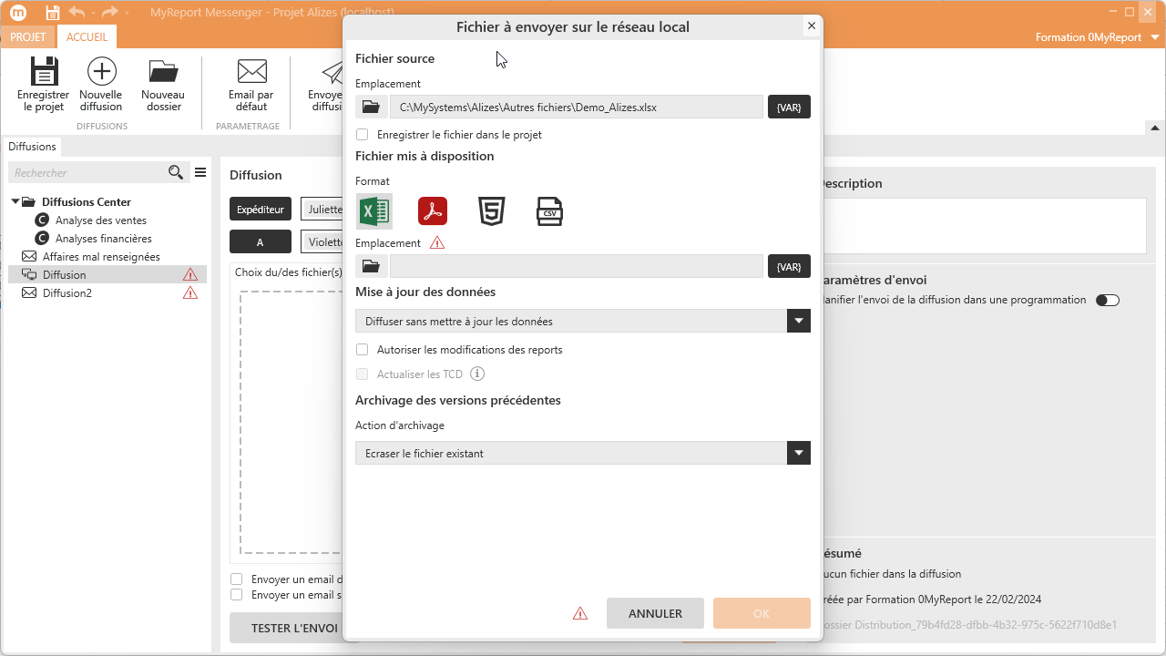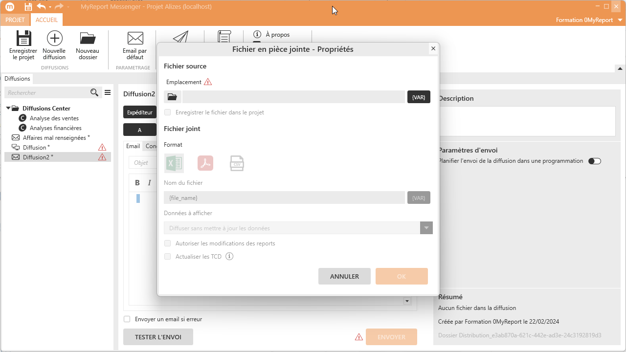 • Diffuser en vidant les reports: tous les reports présents dans le fichier seront vidés de leurs données. Le destinataire devra actualiser les données avec MyReport Builder.