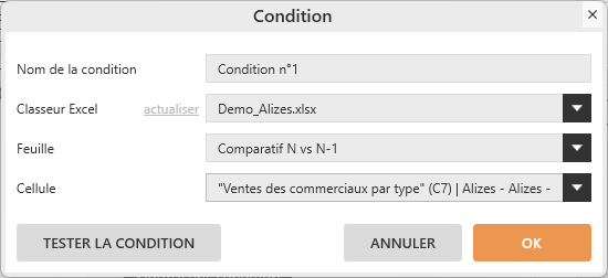 Dans l’exemple ci-dessous, MyReport Messenger testera l’alerte présente dans le classeur Démo Alizés.xlsx, dans l’onglet Comparatif N vs N-1, en cellule E58 de la feuille Ventes des commerciaux par type.