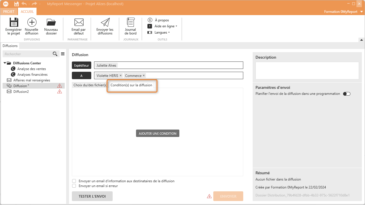 Cliquez sur l'onglet Condition(s) sur la diffusion