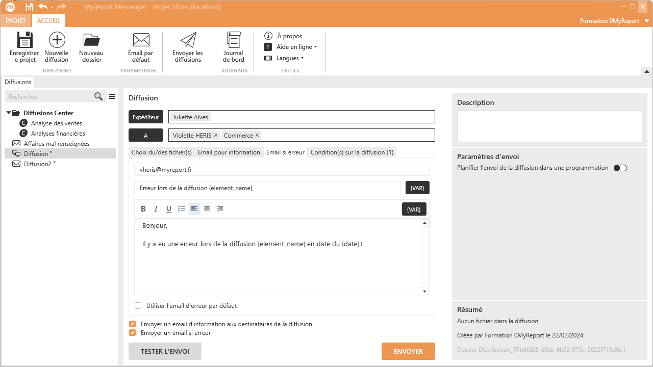 Si un problème est rencontré lors de la diffusion, il est possible de demander à MyReport Messenger d’envoyer un email.