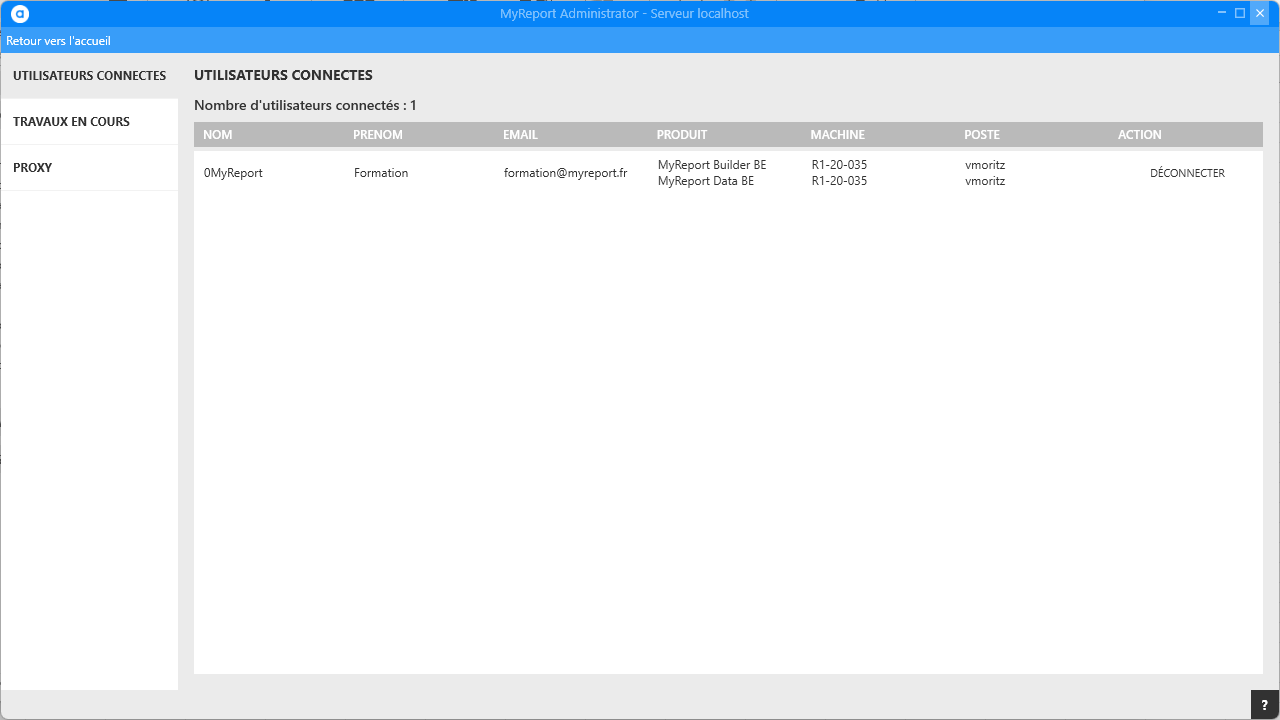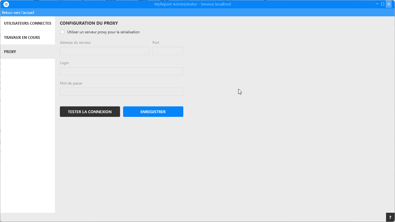 Il est possible depuis MyReport Administrator, en se connectant en Administrateur Système, de gérer les utilisateurs connectés, les travaux en cours mais également de paramétrer le proxy.