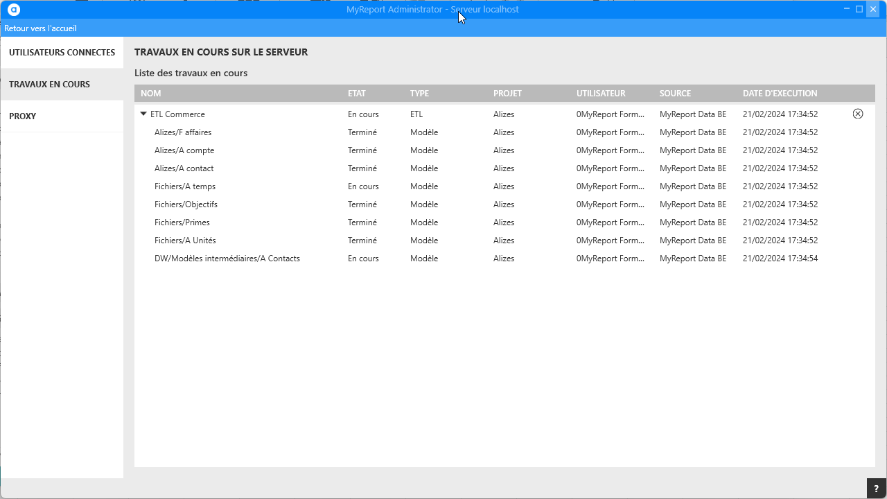 Dans cette fenêtre, vous pourrez voir les travaux en cours d’exécution sur le serveur comme par exemple des ETLs.