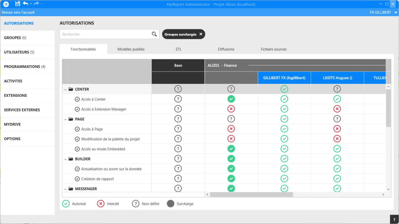 - Autorisations (fonctionnalités, modèles publiés, ETL, diffusions, Fichiers sources)