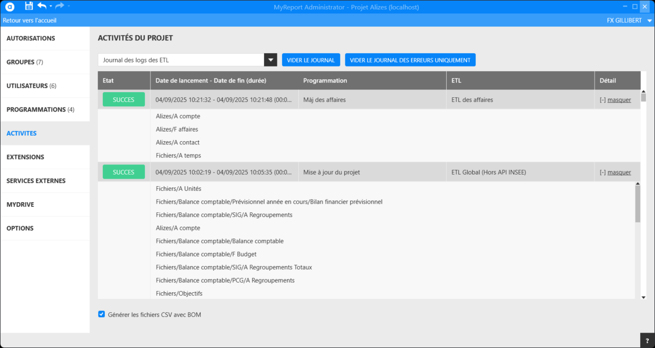 Dans le menu Activités, vous retrouvez les journaux du projet :
