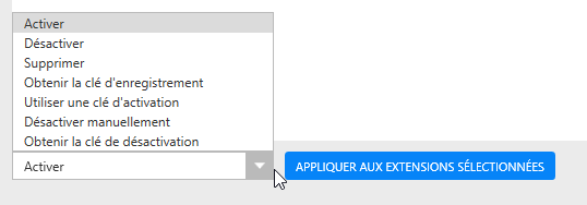 Vous pourrez ensuite effectuer les actions suivantes sur l'extension et l'appliquer aux extensions sélectionnées pour valider votre action :