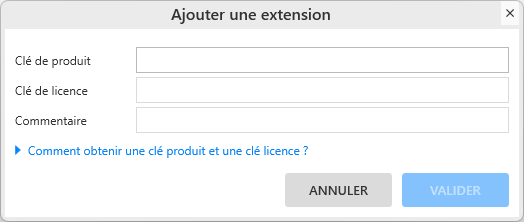 Et renseignez les informations Clé de produit, Clé de licence et un éventuel commentaire :