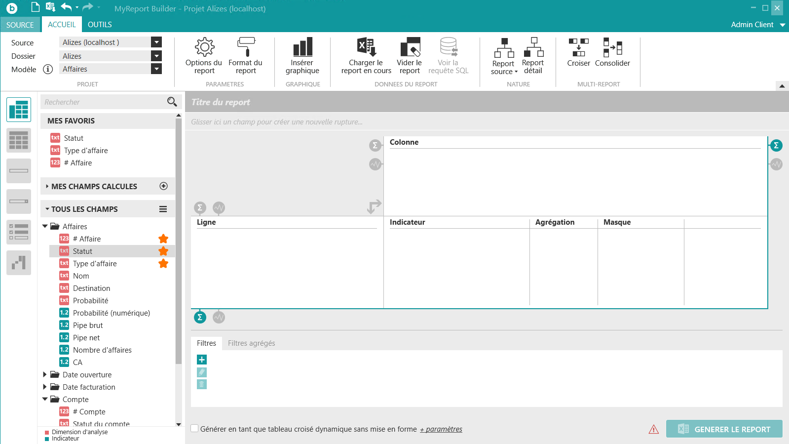 Au lancement de MyReport Builder, vous avez sélectionné la source « Alizés », le dossier « Alizés » et le Modèle « Affaires ». Vous retrouvez ces choix en haut à gauche du menu « Accueil ».