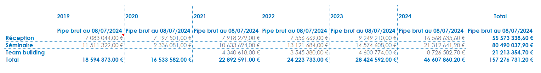Nous allons créer un tableau de la somme du Pipe brut, par Type d'affaire et par Année :