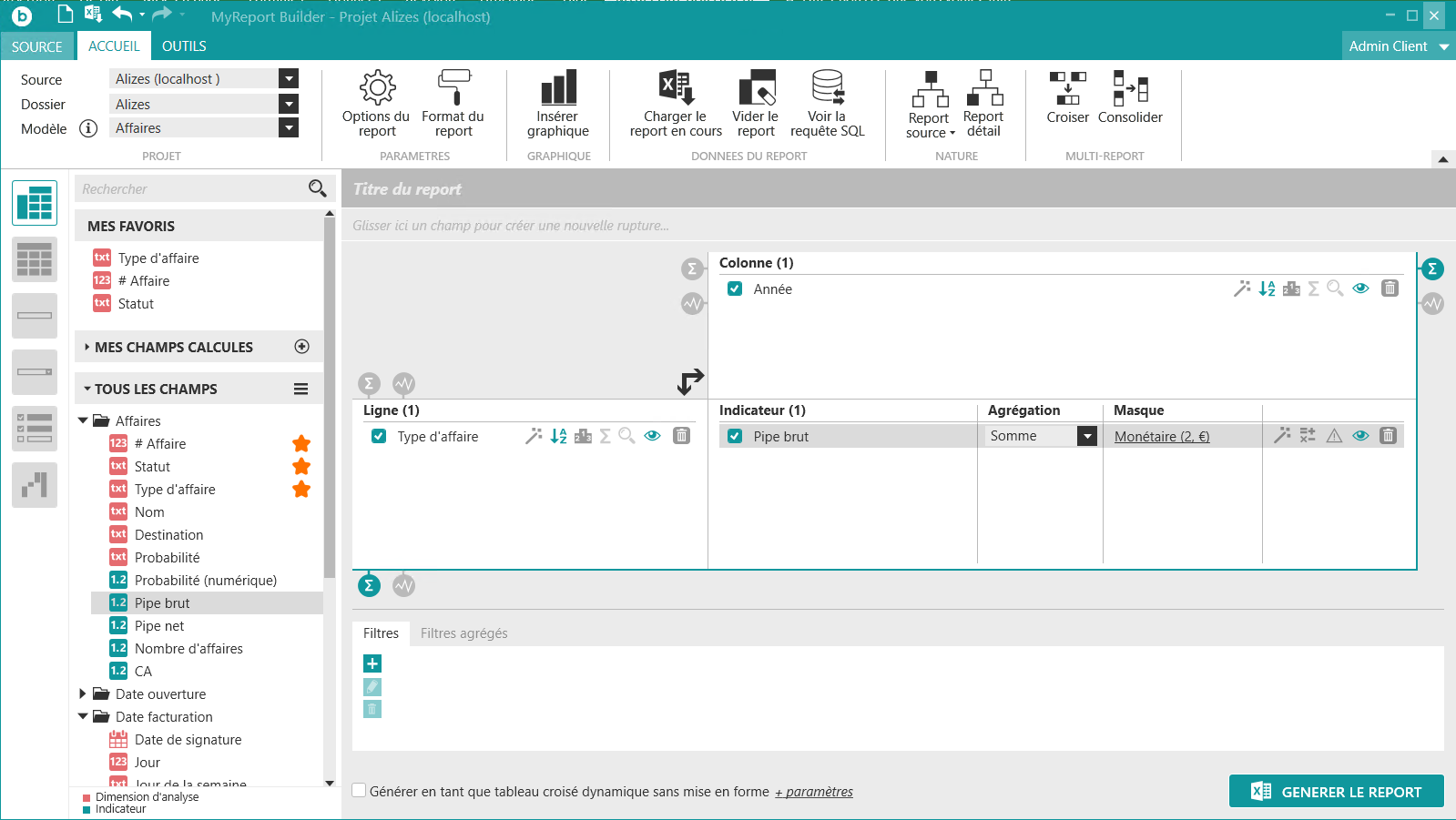 • Double-cliquez sur le champ « Pipe brut » ou cliquez-glisser ce champ dans la zone Indicateur.