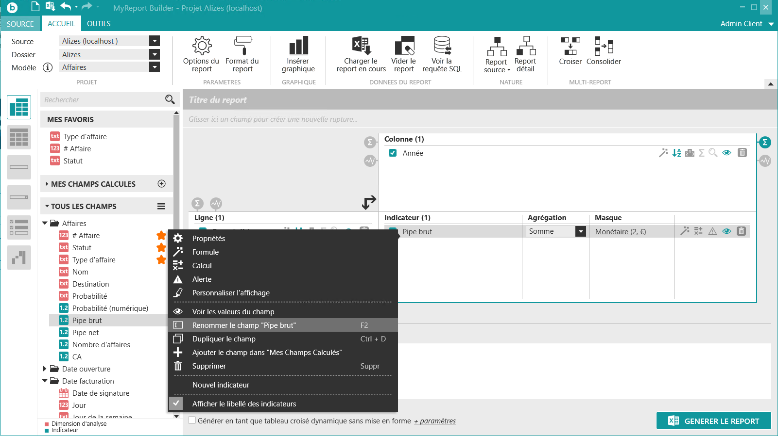Effectuez un clic droit sur un champ et sélectionnez Renommer le champ.