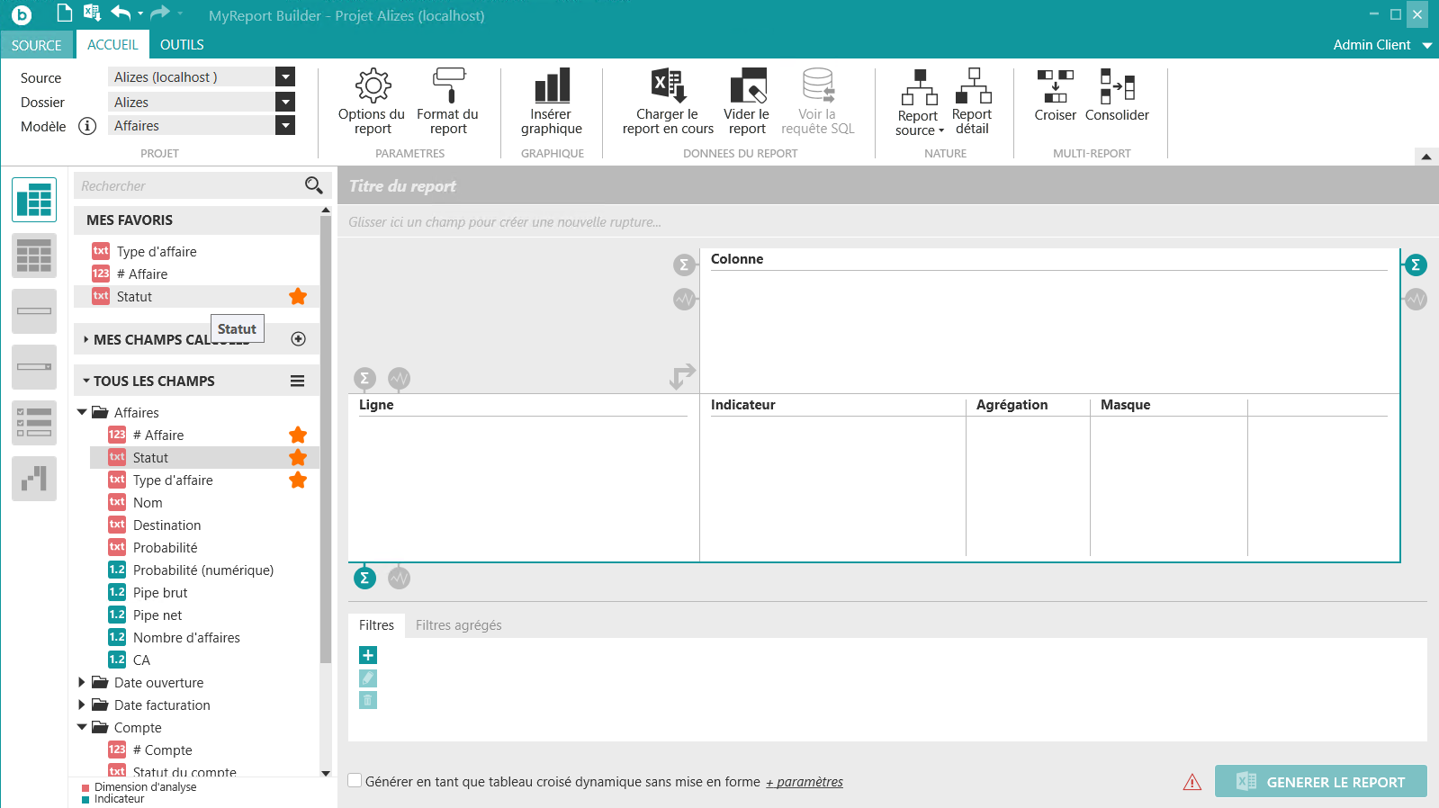 Le bouton « Vider le report » ne supprime pas les filtres du report. Pour repartir sur un nouveau report, cliquez sur l'icône « Nouveau report »   tout en haut de la fenêtre MyReport Builder à gauche au-dessus du menu SOURCE.