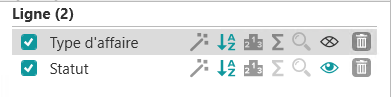 L'œil, en revanche, définit la "visibilité" du champ. Si l'œil est fermé (et si la case à cocher indiquée au paragraphe ci-dessus est bien activée), le champ sera pris en compte dans la requête mais non affiché. Il est possible par exemple de fermer l'œil pour le masquer mais utiliser cette dimension comme ordre de tri. L'œil permet également d'afficher les informations de rupture ou le choix effectué sur un filtre.