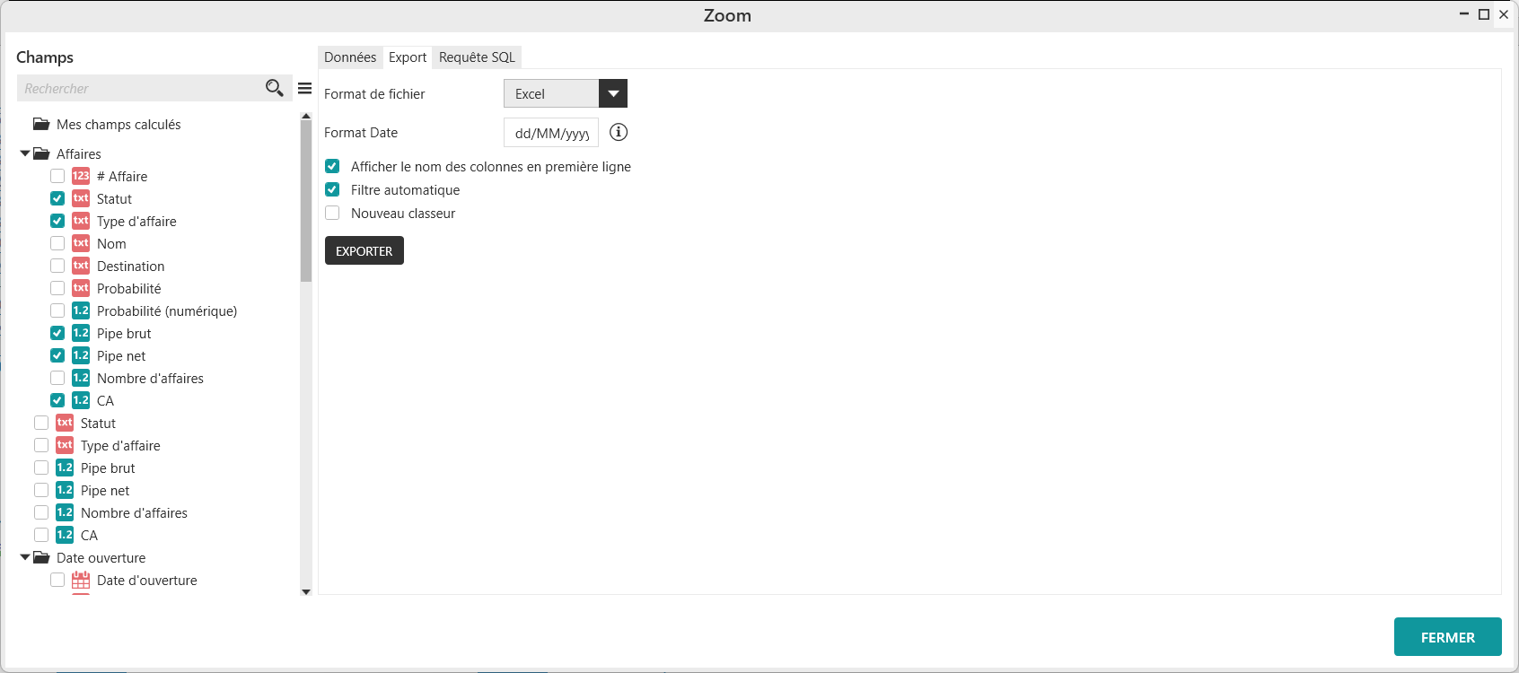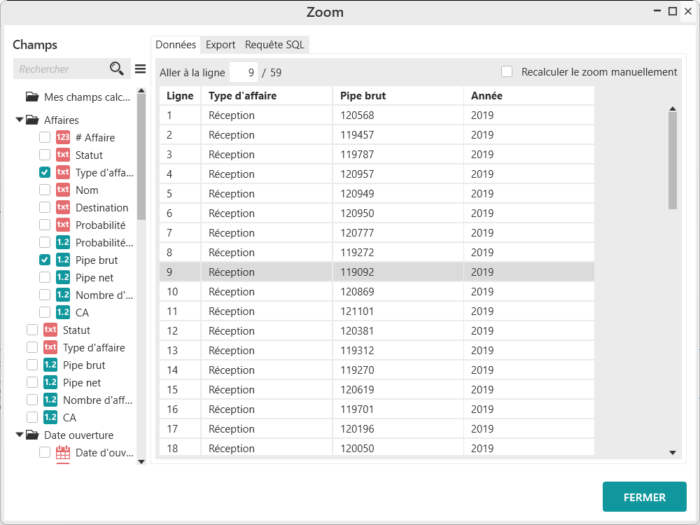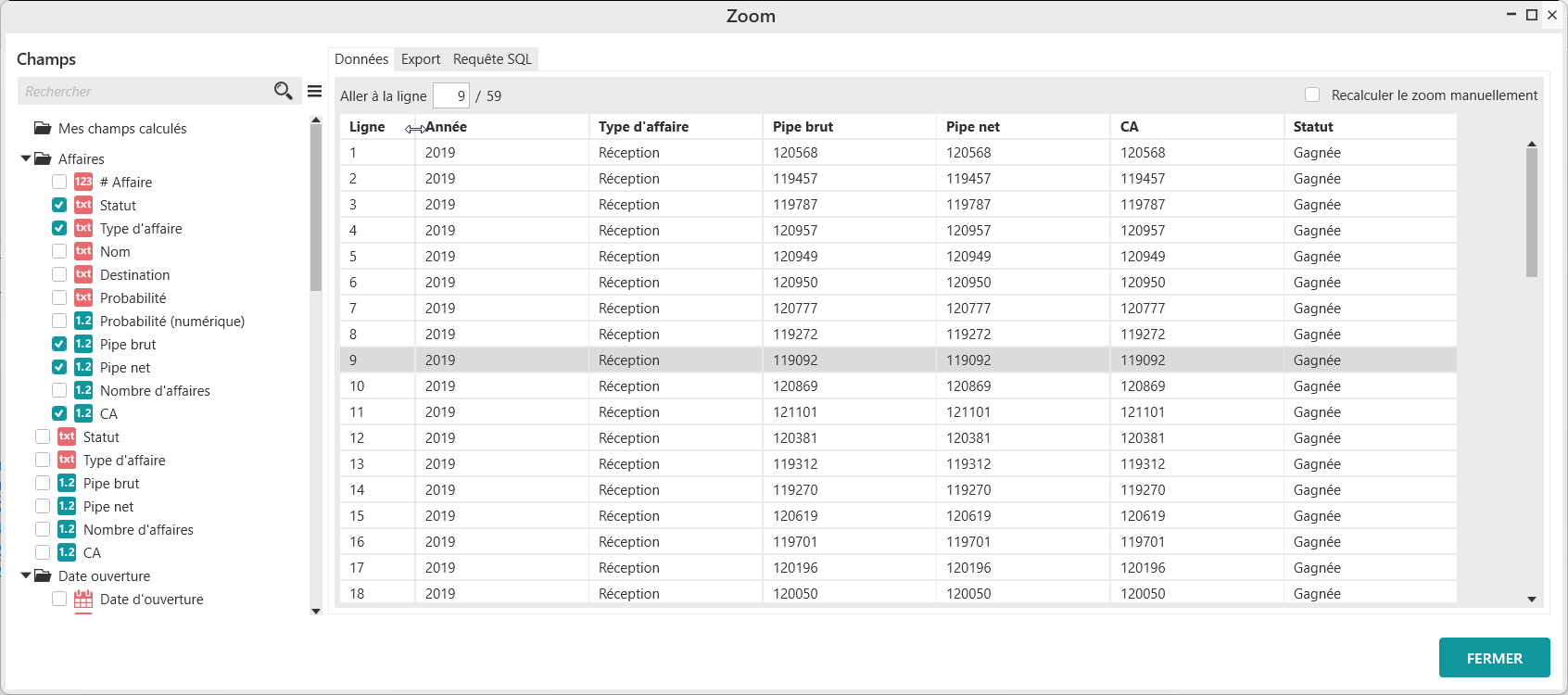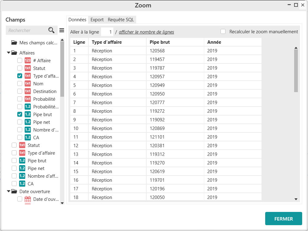 Toute nouvelle exécution du zoom entraînera la reprise des caractéristiques du dernier "Zoom" effectué (à savoir : les champs, la largeur et l'ordre des champs).