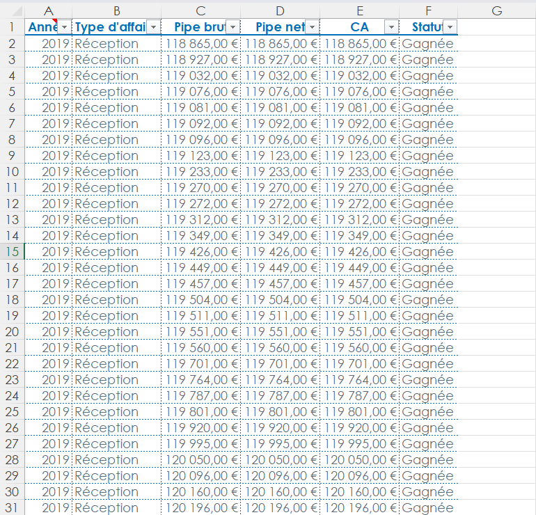 Ces exports Excel contiennent par défaut des filtres automatiques Excel pour faciliter la navigation. Ils peuvent être mis à jour car ce sont des reports au format listing.
