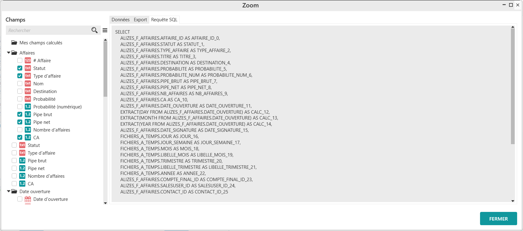 Dans la fenêtre du zoom, cliquez sur l’onglet « Requête SQL » pour voir la requête générée.