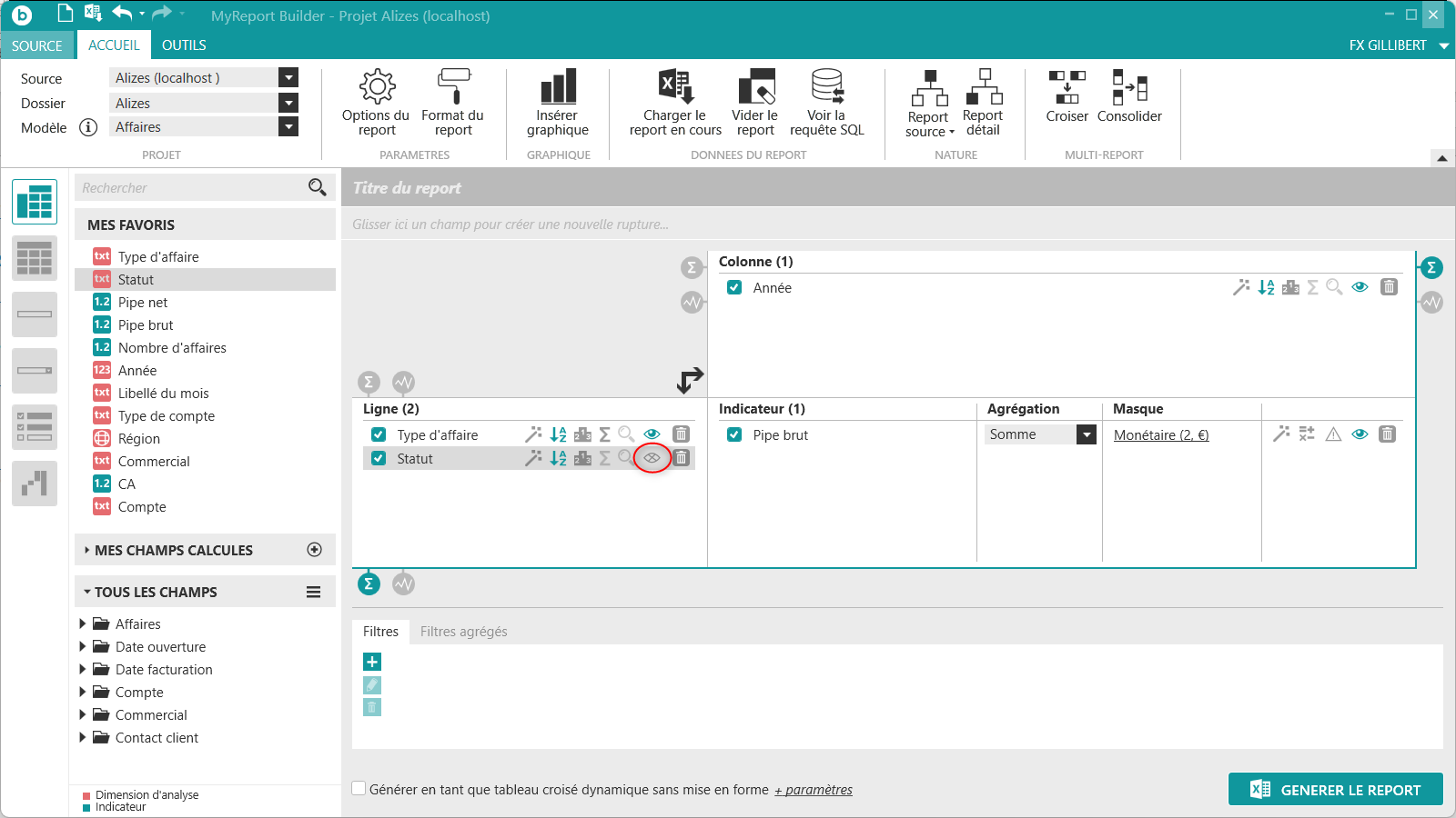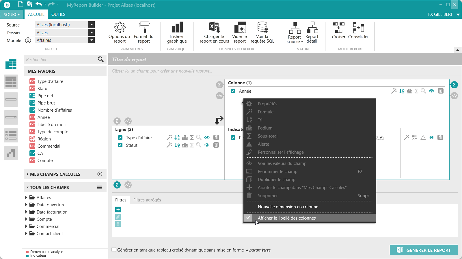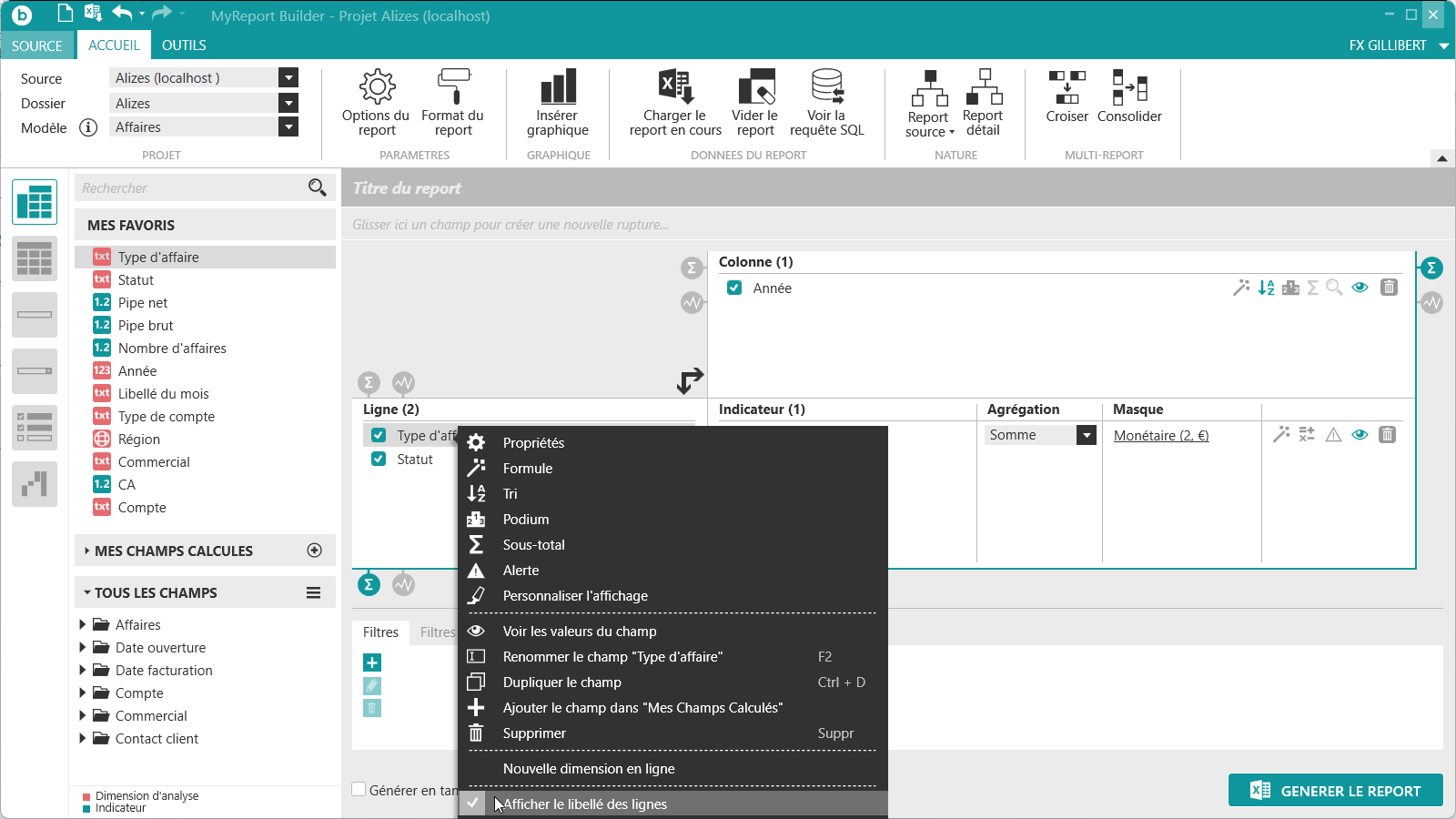 située tout en haut à gauche de MyReport Builder. Puis positionnez dans votre report les champs suivants du modèle Affaires :