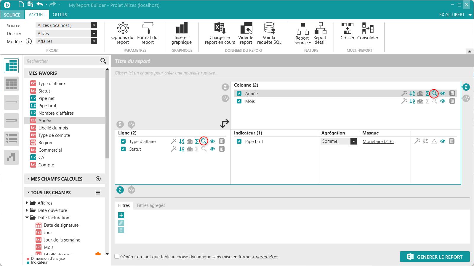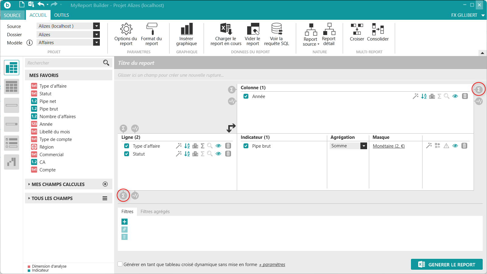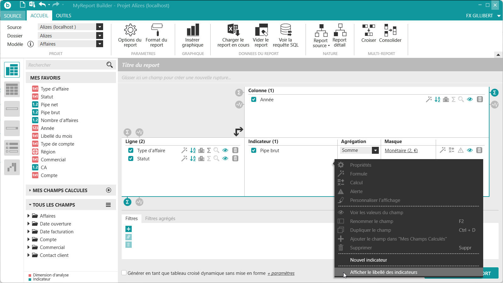 située tout en haut à gauche de MyReport Builder. Puis positionnez dans votre report les champs suivants du modèle Affaires :
