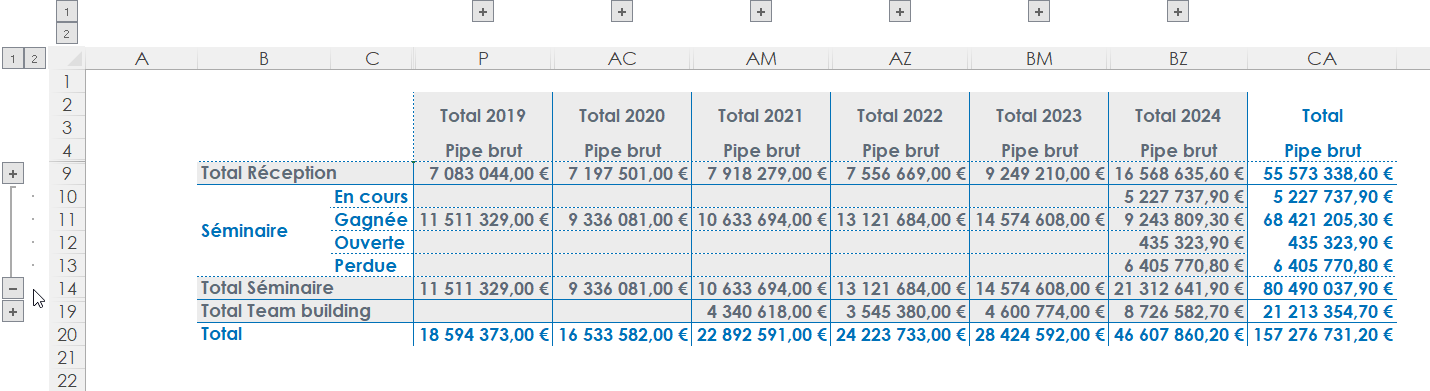 Le détail des valeurs ainsi que les sous-totaux ne sont pas affichés par défaut. Pour accéder au détail des données, il suffit de cliquer sur les boutons « + » situés au-dessus et à gauche du tableau.