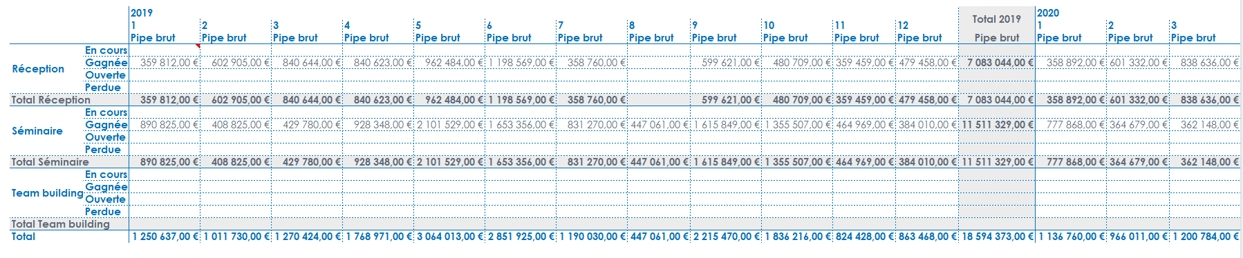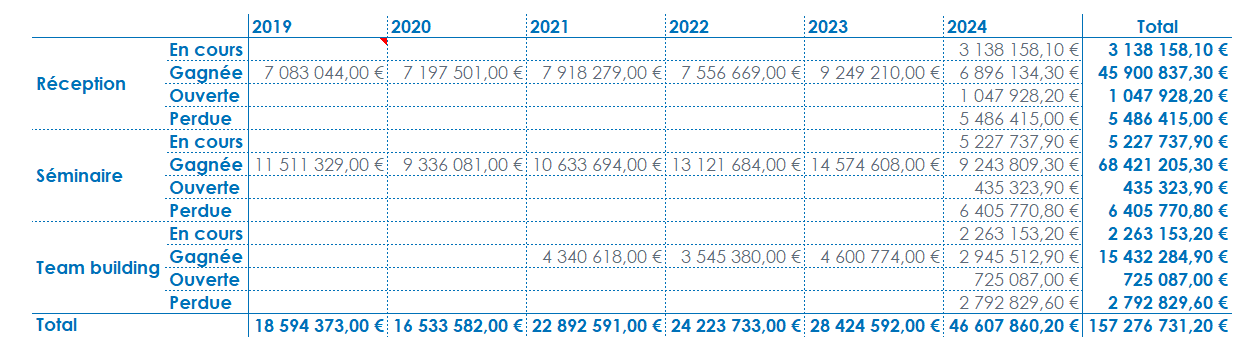 Par défaut, les totaux sont affichés à droite et en bas. Ils reprennent l'agrégation du ou des indicateurs positionnés dans le report.