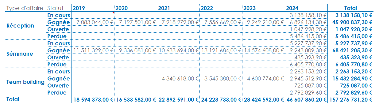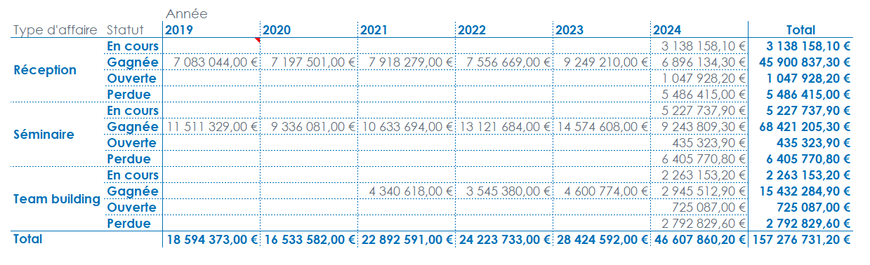 Les données sont affichées suivant le Type d'affaire, cependant la dimension Statut n’apparaît plus.