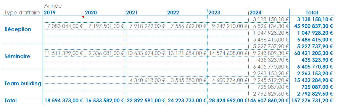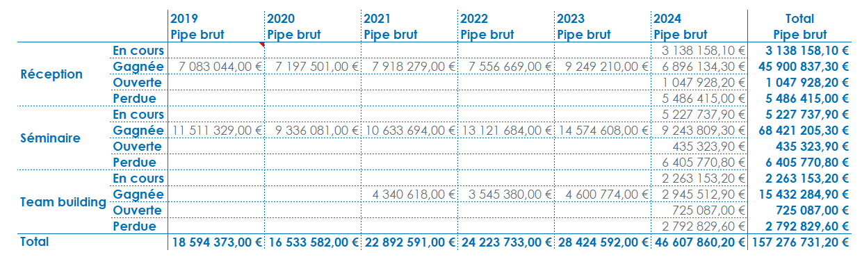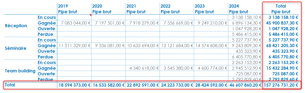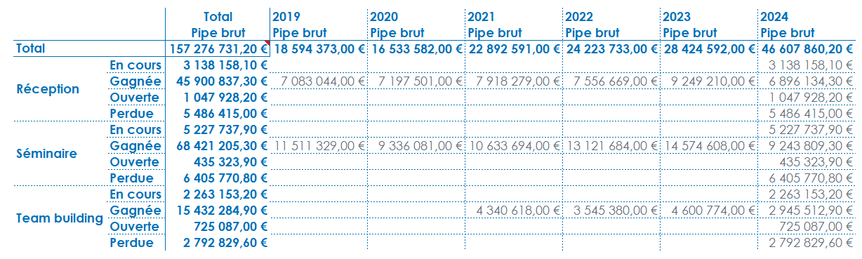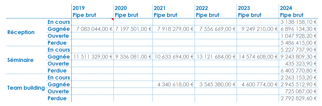 Activez les Sous-totaux pour la dimension d’analyse en ligne Type d'affaire et pour la dimension Année en colonne. Vous demandez ainsi l’affichage du sous-total par défaut des indicateurs, qui est calculé selon l’agrégation de ces derniers. Dans le cas présent, les sous-totaux des Type d'affaire et des Année afficheront la somme du Pipe brut par type d'affaire et par année.