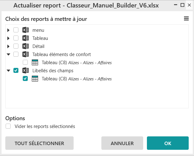 Vous pouvez choisir les feuilles ainsi que les reports à mettre à jour en les cochant dans la liste/arborescence ou tout sélectionner en cliquant sur le bouton « Tout sélectionner ».