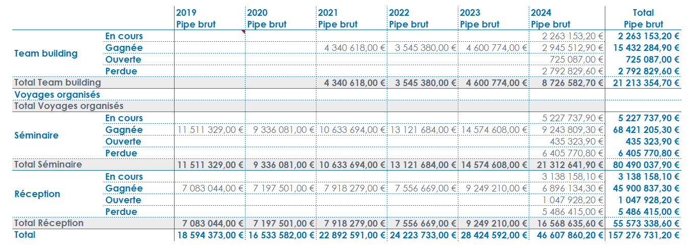 De plus, il est possible d'ajouter une nouvelle valeur (Voyages organisés, par exemple), l’objectif est de préparer le tableau pour l’ajout d’un nouveau Type d'affaires. Ce nouveau type doit être affiché dans le tableau de bord, même si aucune donnée n’y est actuellement affectée.