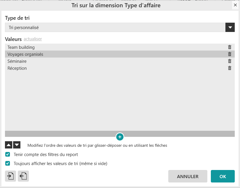 Déplacez les valeurs comme vous souhaitez les trier. Dans notre exemple, les Team Building en premier, puis les Séminaires et enfin les Réceptions.