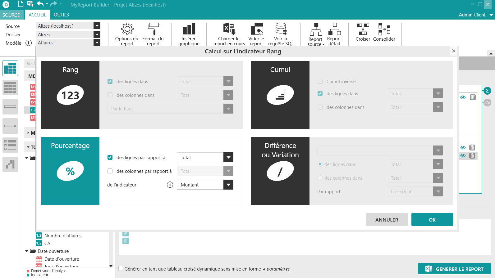 Effectuez un clic droit sur ce nouveau champ et choisissez Calcul puis dans la fenêtre Calcul sur l’indicateur, cliquez sur l’encadré « Pourcentage » afin d’activer le mode de calcul pourcentage. Choisissez un pourcentage des lignes.
