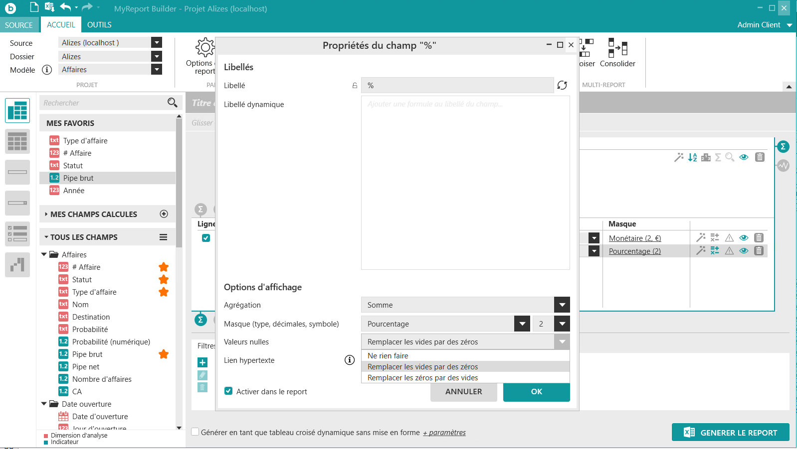 Dans MyReport Builder, effectuez un clic-droit sur l’indicateur « % », et sélectionnez Propriétés puis dans la fenêtre Propriétés du champ %, choisissez Remplacer les vides par des zéros de la zone Valeurs nulles.