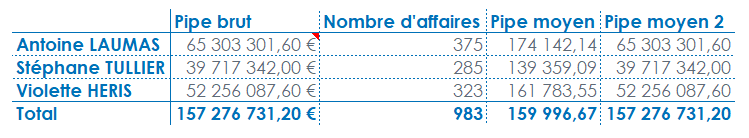 « Pipe Moyen » = Somme du Pipe brut / Somme du Nombre d'affaires.