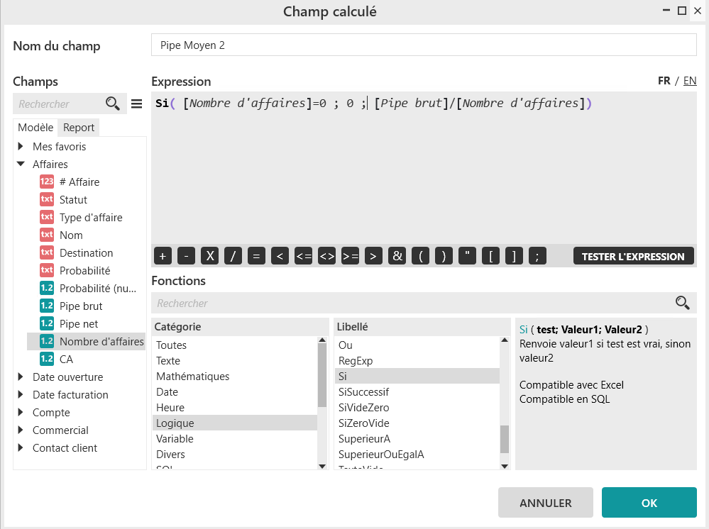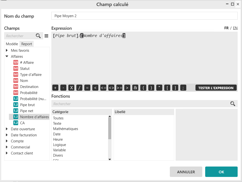 Dans l'expression du « Pipe Moyen 2 », vous remarquez que les champs du modèle sont entourés d'un simple crochet : [Pipe brut]/[Nombre d'affaires]. Alors que pour l'expression du premier champ calculé « Pipe Moyen », les champs du report sont entourés par des doubles crochets : [[Pipe brut]]/[[Nombre d'affaires]].