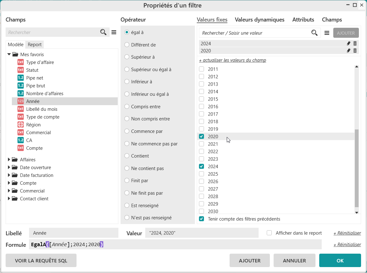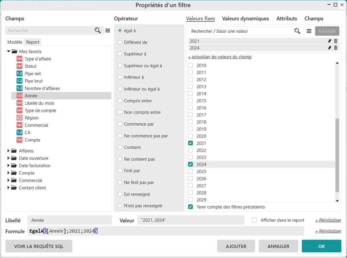 La fenêtre Propriétés d'un filtre apparaît. L’opérateur « Egal à » et le type de filtre « Valeurs fixes » sont sélectionnés par défaut.