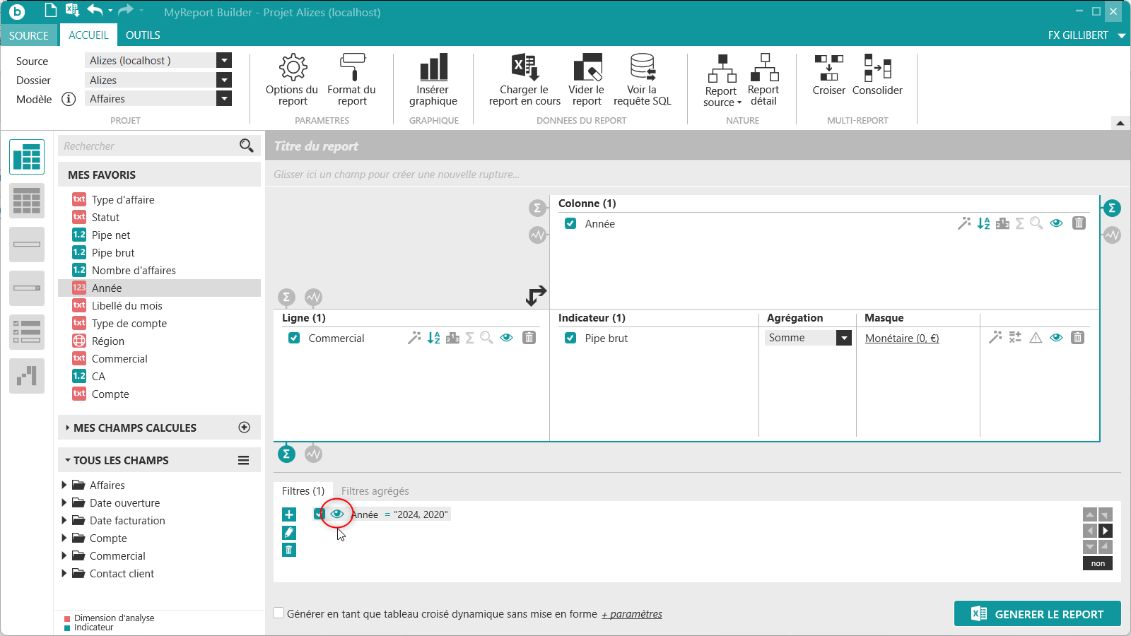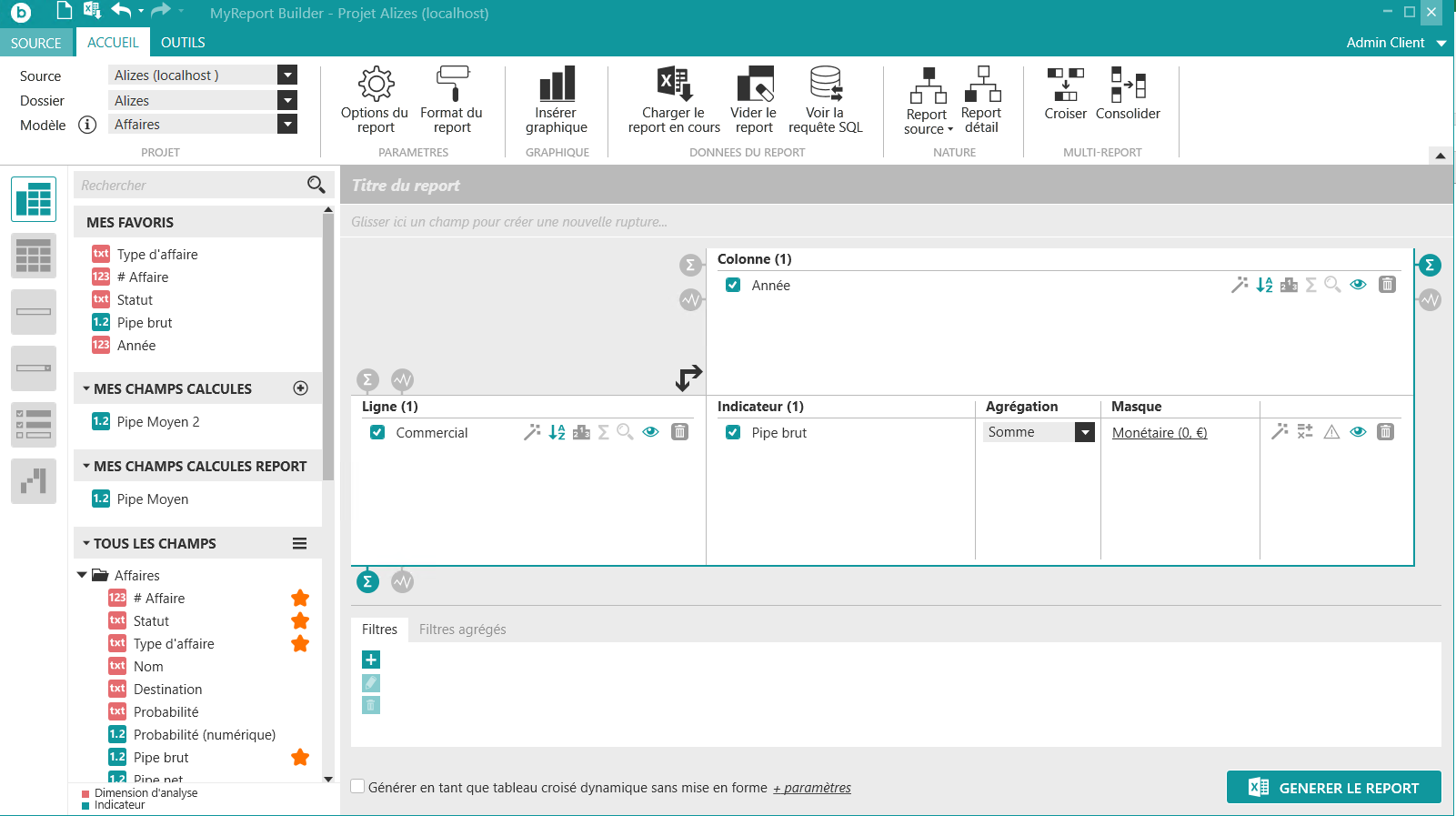 située tout en haut à gauche de MyReport Builder. Positionnez dans votre report les champs suivants du modèle Affaires :