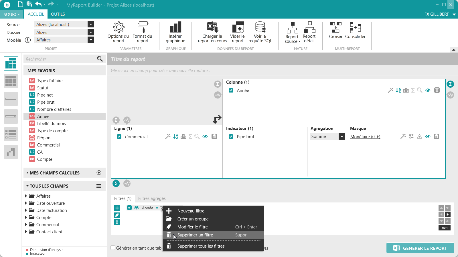 Pour supprimer un filtre, effectuez un clic droit sur le filtre et Supprimer un filtre OU Sélectionnez le filtre et cliquez sur le bouton