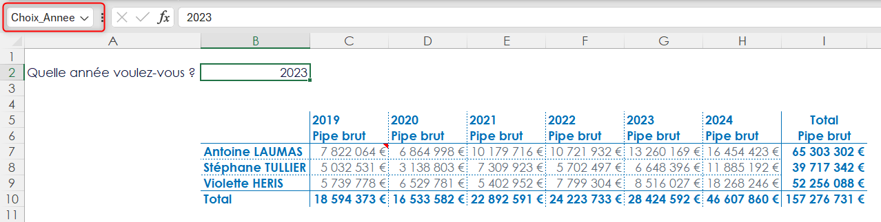 Nommez la cellule B2, par exemple, « Choix_Annee » dans la feuille Excel. Pour rappel, pour créer une cellule nommée dans Excel, sélectionnez la cellule Excel (par exemple B2) puis saisissez un nom (« Choix_Annee » par exemple) à la place de la référence « B2 » (en haut à gauche du classeur), et validez par la touche « Entrée ». Attention, dans Excel, les noms des cellules ne doivent pas comporter d'espace, ni d'accents pour certaines versions d'Excel, ni les caractères : $ \ / # ? * [ ] ( ) { }. Egalement pour rappel, vous pouvez retrouver l'ensemble des cellules nommées dans le classeur via le menu Formules, Gestionnaire de noms.
