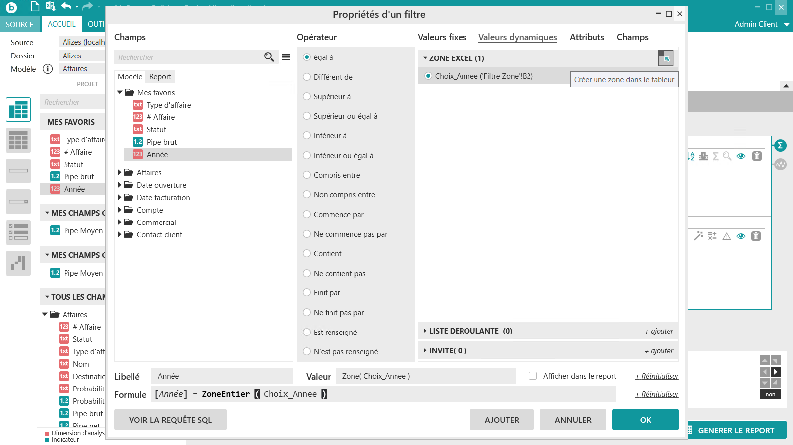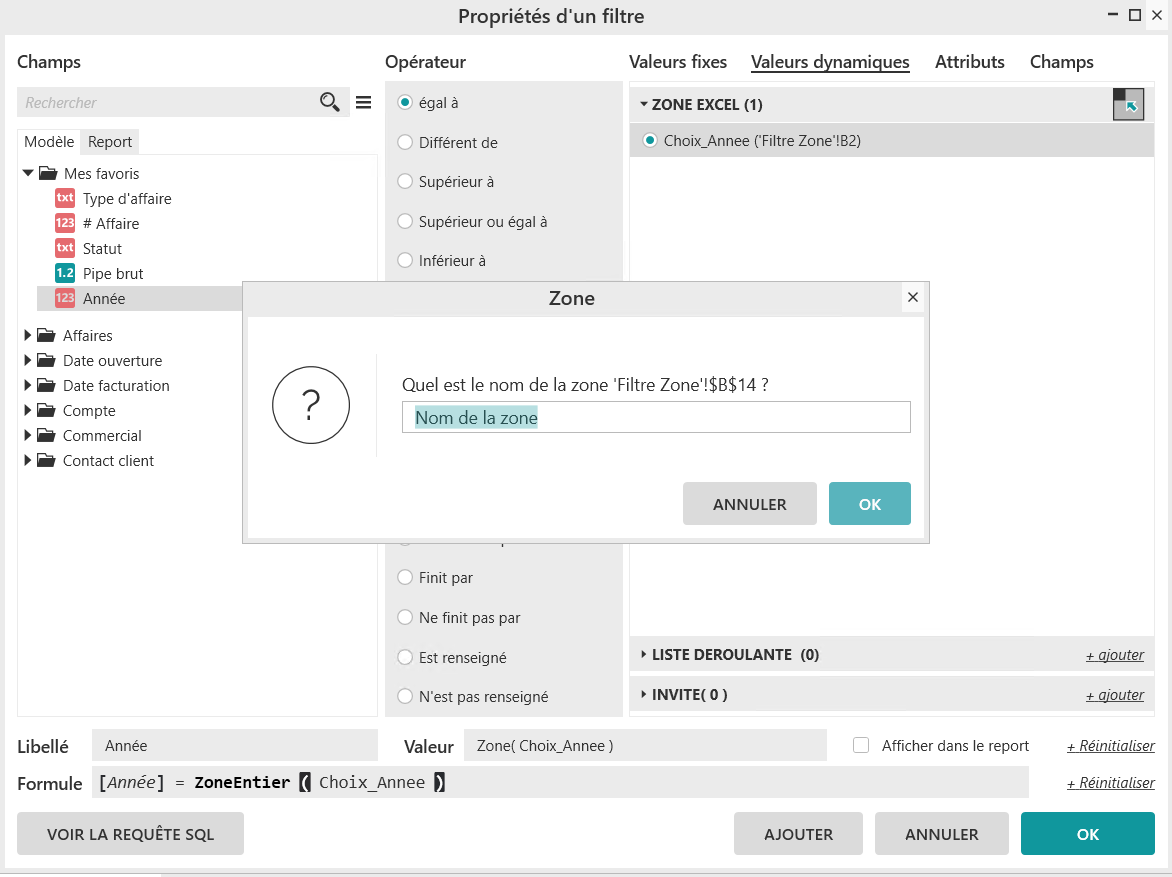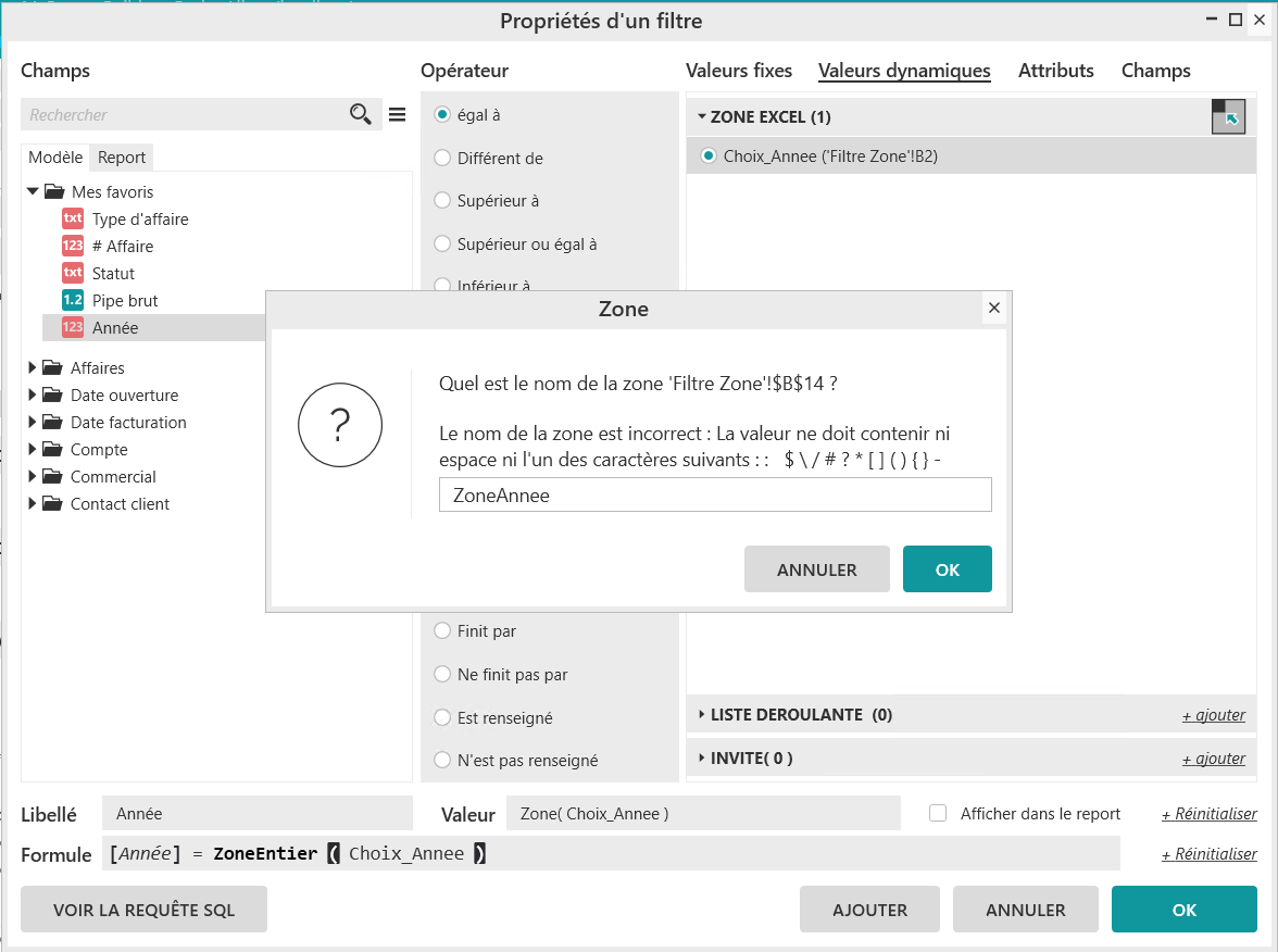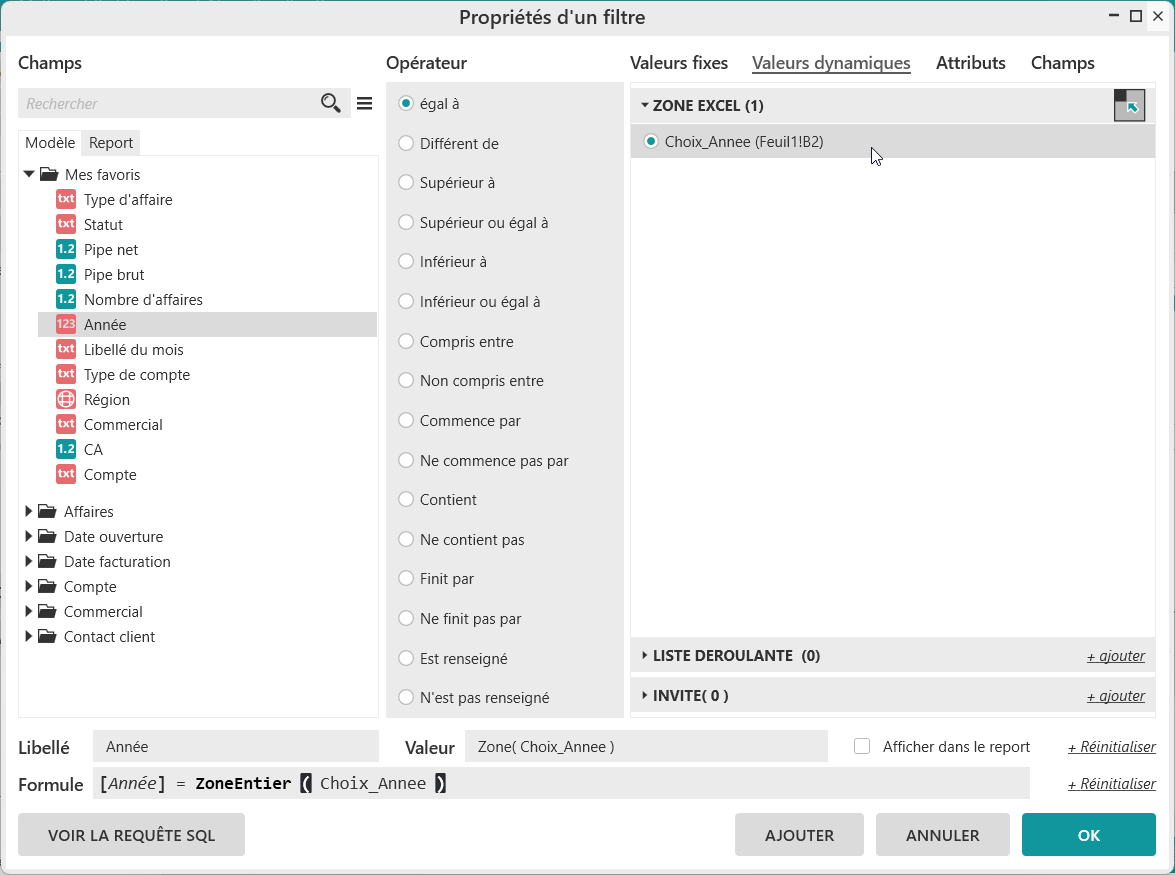 Le filtre indique que le champ « Année » est égal à une Zone nommée Choix_Annee :