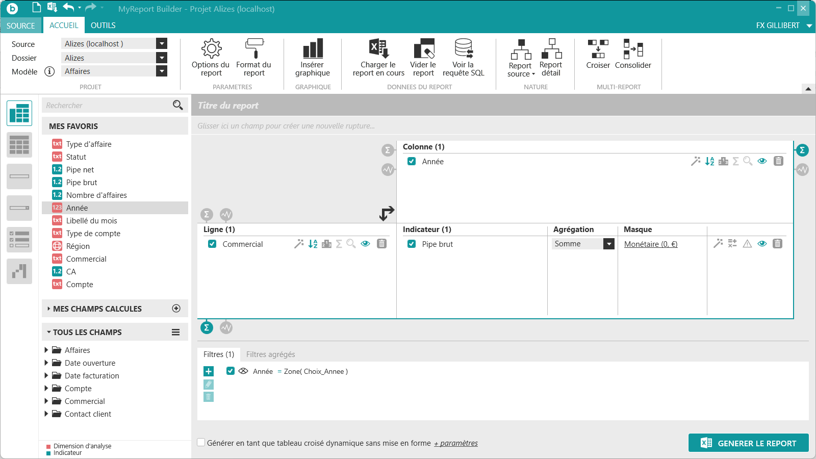 Ajoutez le champ « Année » dans l'onglet Filtres situé en bas de MyReport Builder.