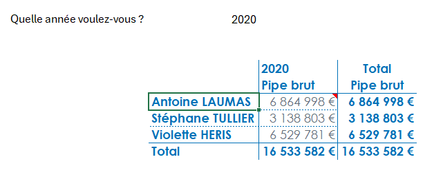 Saisissez la valeur « 2020 » dans la cellule B2 « Choix_Annee ». Puis, sélectionnez une des cellules du report, par exemple C7.