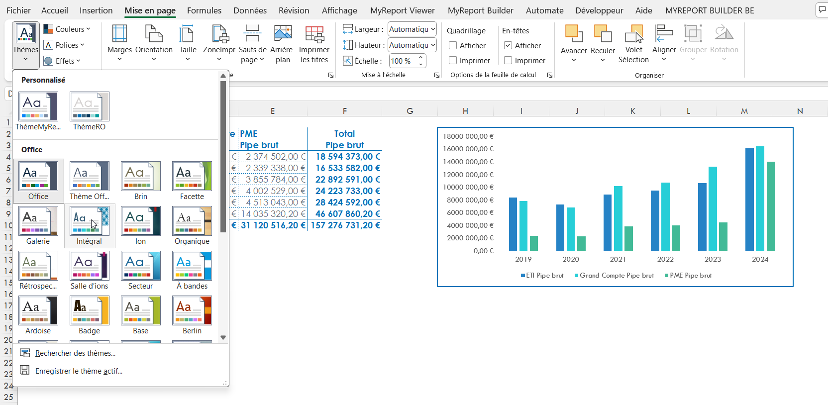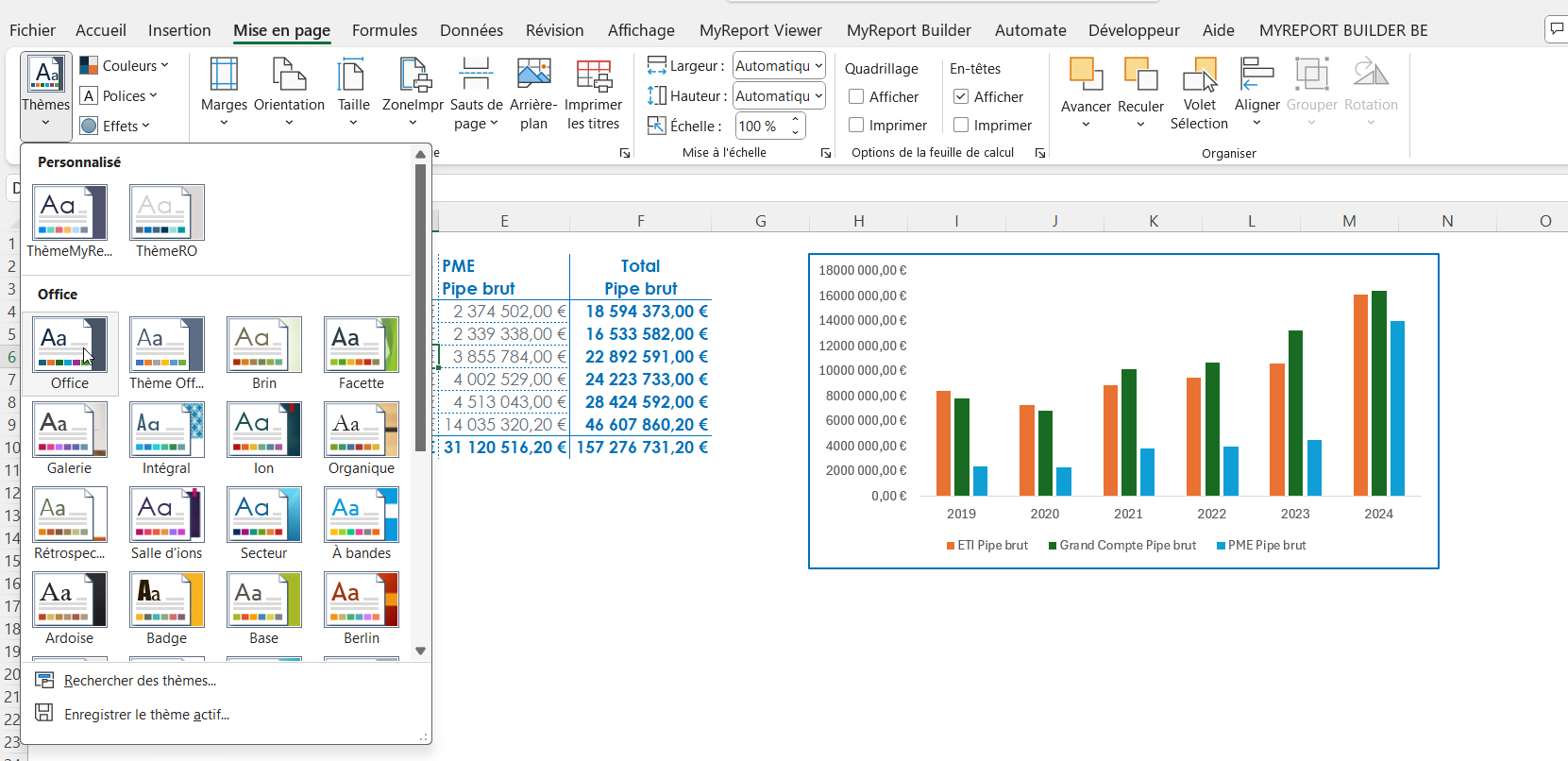 Dans le menu « Mise en page » d'Excel, sélectionnez un des Thèmes de couleurs approprié. Pour rappel, chaque thème utilise un ensemble de couleurs, polices et effets pour créer une présentation homogène.