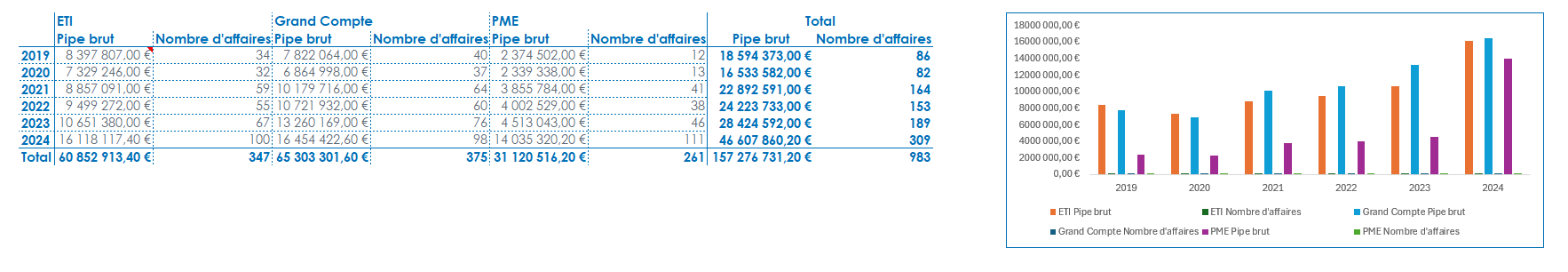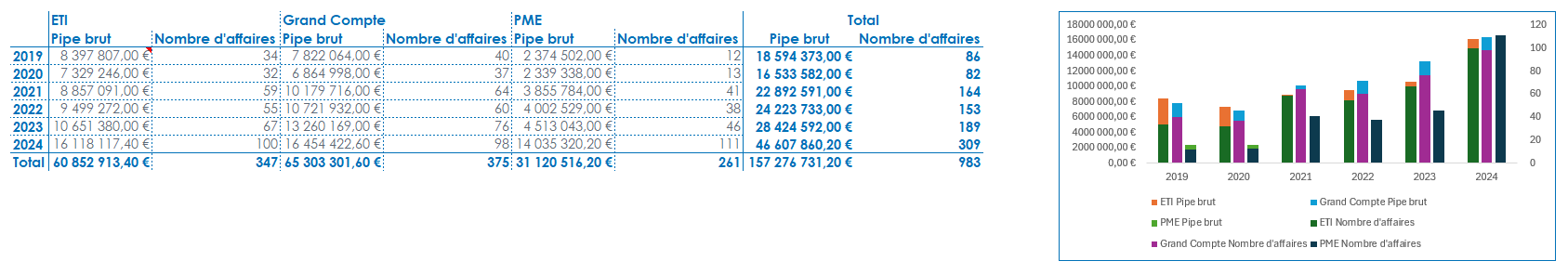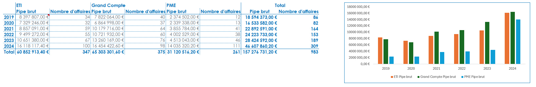 Le Nombre d'affaires (quelques dizaines) et les montants de Pipe brut (plusieurs millions) ayant des valeurs très différentes, l'échelle de l'axe des ordonnées (à gauche) ne permet de voir les barres d'histogrammes du nombre d'affaires. Nous devons créer un axe secondaire.