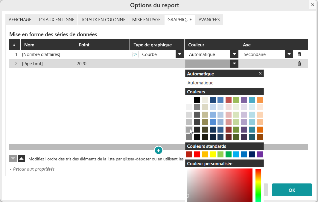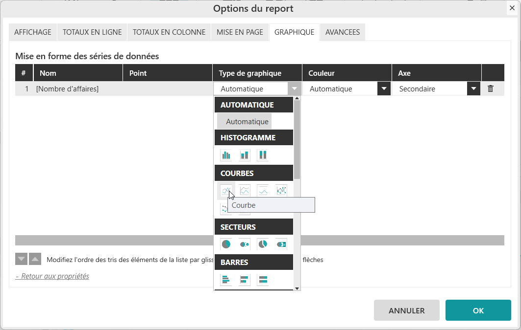 Les options de Mise en forme des séries de données permettent de modifier, pour chaque indicateur, son type de graphique, sa couleur, son axe principal ou secondaire (*) :