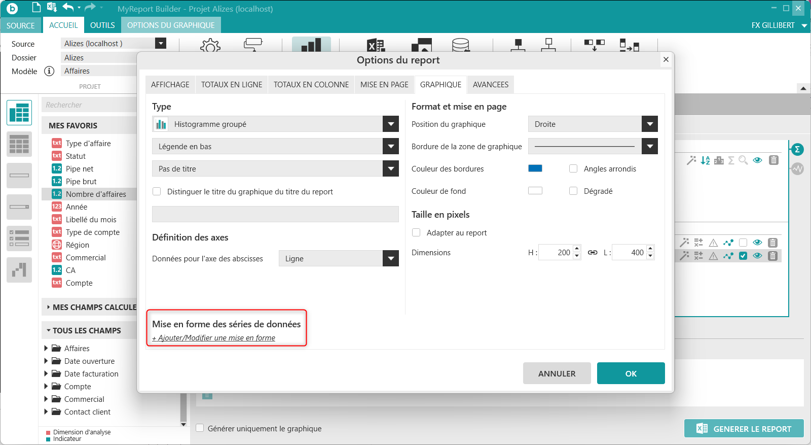 Les options de Mise en forme des séries de données permettent de modifier, pour chaque indicateur, son type de graphique, sa couleur, son axe principal ou secondaire (*) .