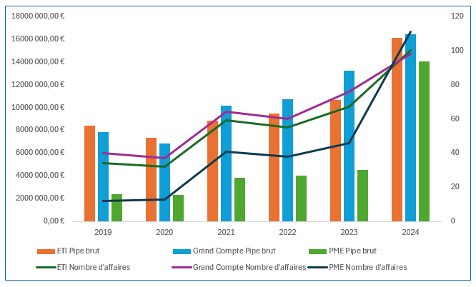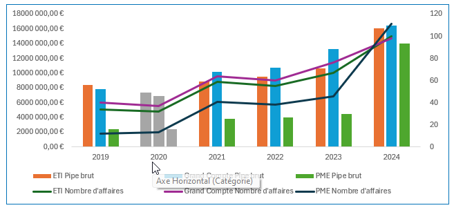 Validez et générez le report, le graphique affiche désormais les montants de pipe brut en histogrammes et les nombres d'affaires en courbes :