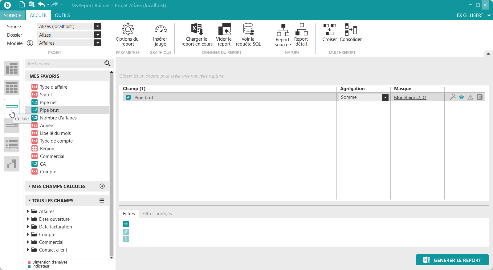 Créez un nouveau report cellule et ajoutez le champ « Pipe brut ».