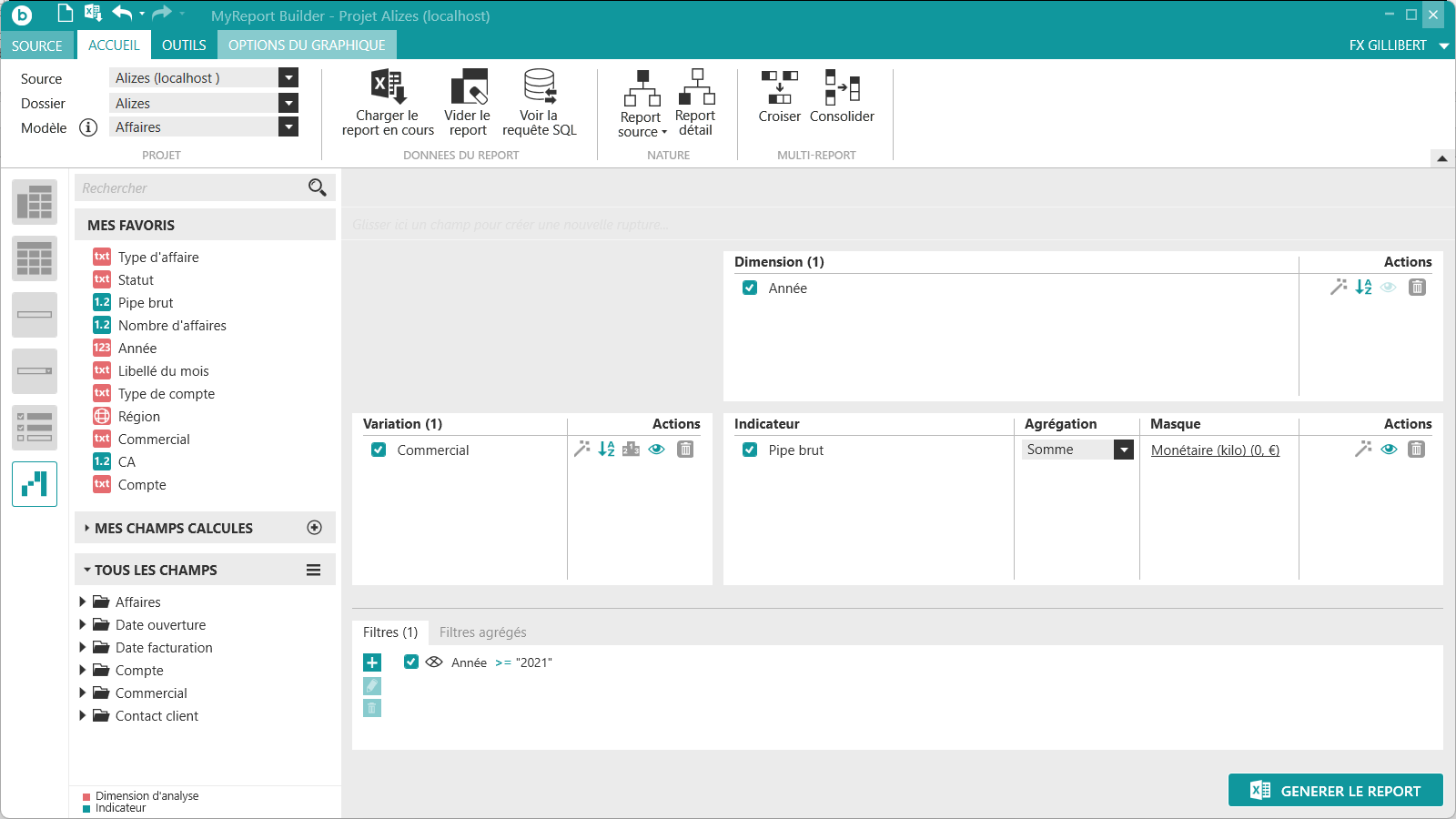 Puis positionnez dans votre report les champs suivants du modèle Affaires :
